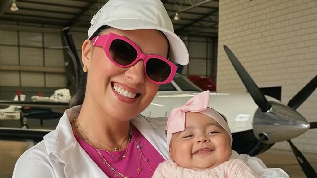 A bebê de 3 meses de vida pegou um jatinho junto com a influenciadora para encontrar o papai em Nova Mutum, no Mato Grosso, onde fará um show durante a noite.