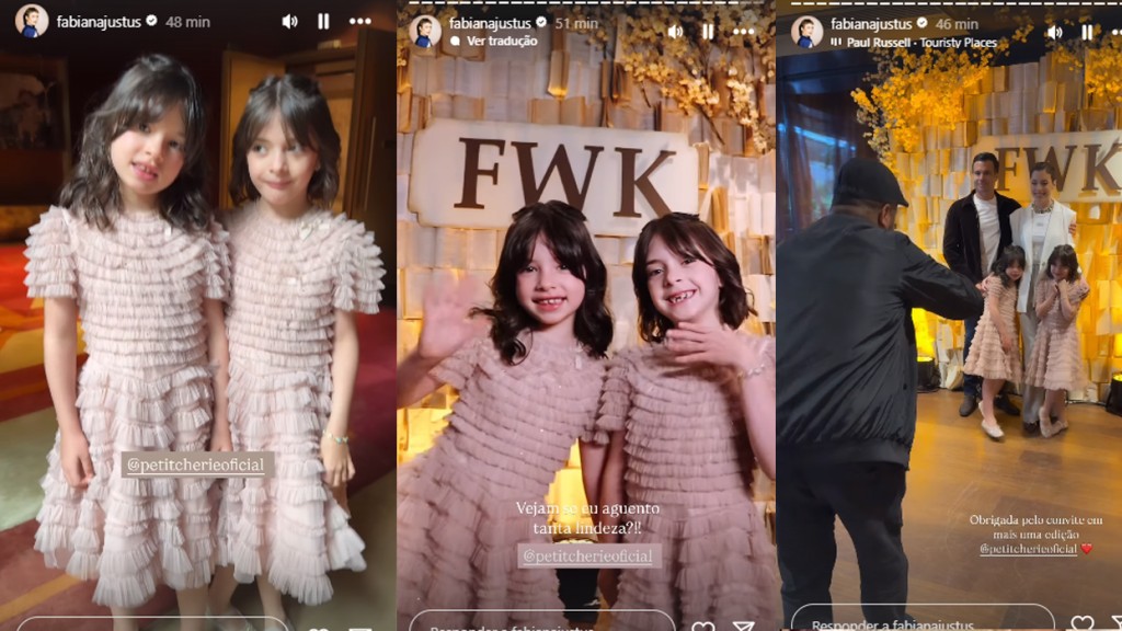 A empresária e influenciadora Fabiana Justus, de 38 anos de idade, desfilou com as filhas, as gêmeas Chiara e Sienna, de 6 anos, em evento de moda da Petit Cherie, no Fashion Week Kids, no hotel Rosewood, na manhã deste domingo (6), em São Paulo. Na passarela, ela usou uma calça cinza e top branco, enquanto a duplinha deu um show de fofura com duas trocas de look: primeiro com vestidos rosas e depois com looks brancos combinando.