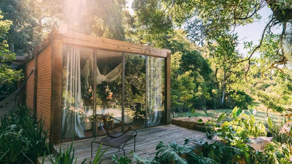 O refúgio integrado à natureza tem paredes de tijolo à vista e está dividido em quatro partes. Em uma ponta, a cama de casal com dossel em frente a uma grande janela tem uma vista belíssima para a mata. No meio da cabana, a sala de estar – sem televisão, para se desconectar de tudo mesmo – tem sofá de dois lugares e uma lareira. À frente, a cozinha equipada tem uma mesa de madeira com duas cadeiras felpudas. Por último, o banheiro também tem uma grande vista para a Mata Atlântica. Do lado de fora, há uma churrasqueira e uma piscina com pedras. Reserve aqui .