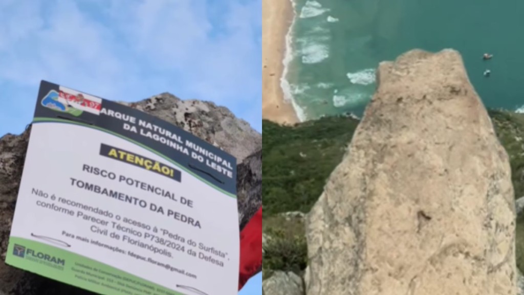 Considerada como um dos pontos turísticos mais famosos de Florianópolis, a Pedra do Surfista está com “risco potencial de tombamento”, segundo a prefeitura da cidade. Há placas que sinalizam a erosão sofrida pela rocha no alto do Morro da Coroa, no Parque Natural Municipal da Lagoinha do Leste.
