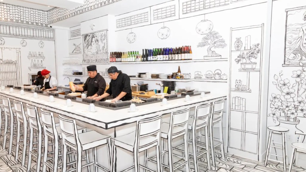 Parte do trabalho foi mostrado em vídeos publicados nas redes sociais do Shirokuro. “Não queríamos que fosse como papel de parede, queríamos que as mãos do artista estivessem em todos os aspectos do restaurante, das paredes ao chão, às mesas e cadeiras”, disse Lim.